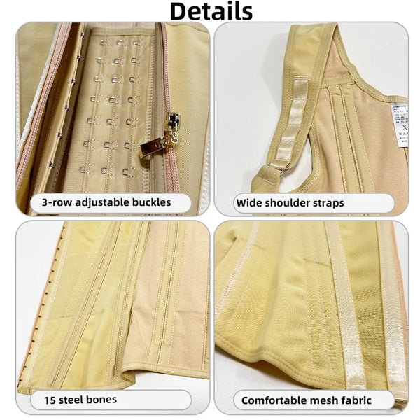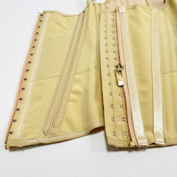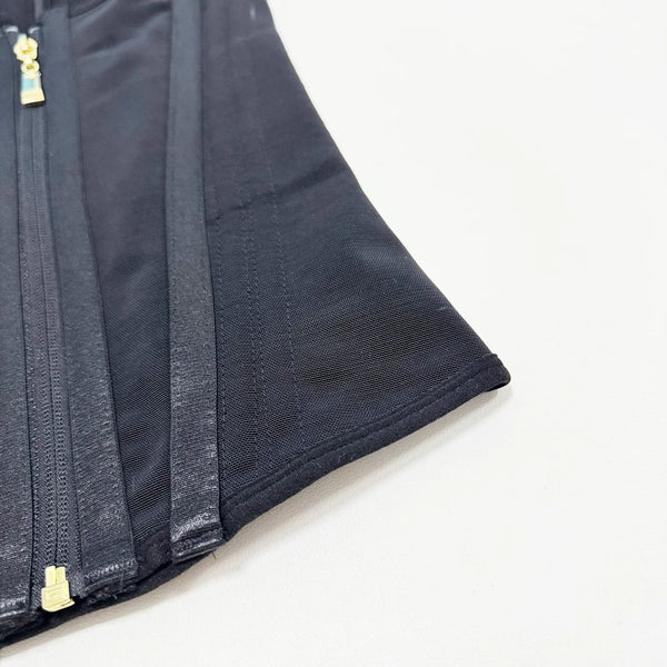 - Zipper front with inner hook-and-eye closure for adjustable control