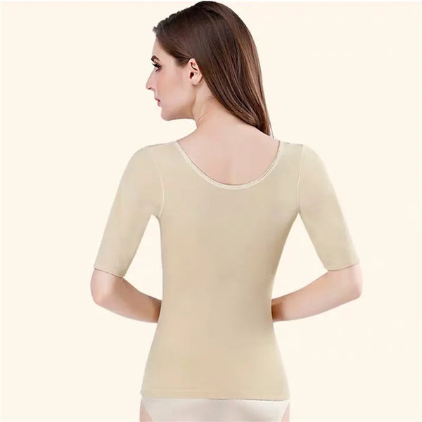Streamline your upper body with this seamless short-sleeve shapewear top, crafted to gently contour the waist and abdomen while remaining discreet under clothing.